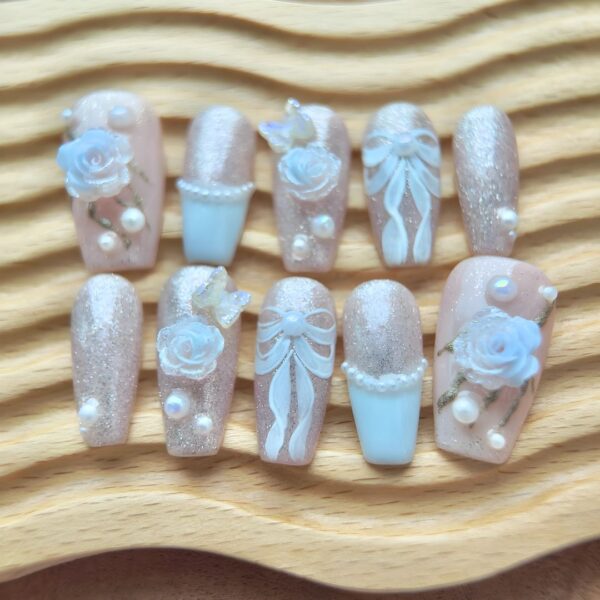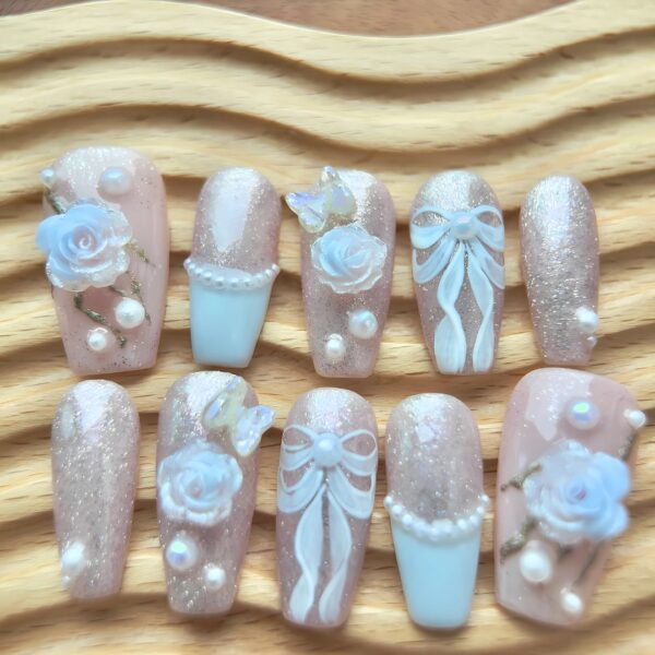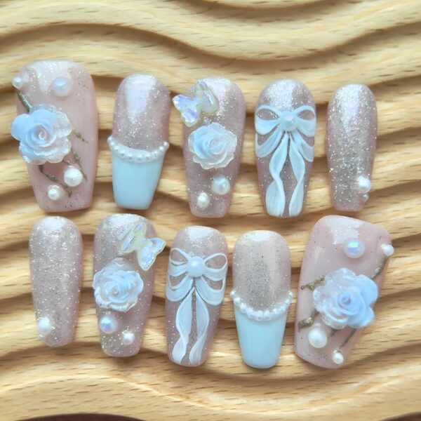 This elegant press-on nail set features a shimmering rose-gold base, adorned with 3D camellia flowers that magically change color, delicate pearls, crystal butterflies, and graceful ribbon accents. The sparkling finish paired with intricate hand-sculpted details creates a dreamy and luxurious look, perfect for those who love a touch of fairy tale elegance.